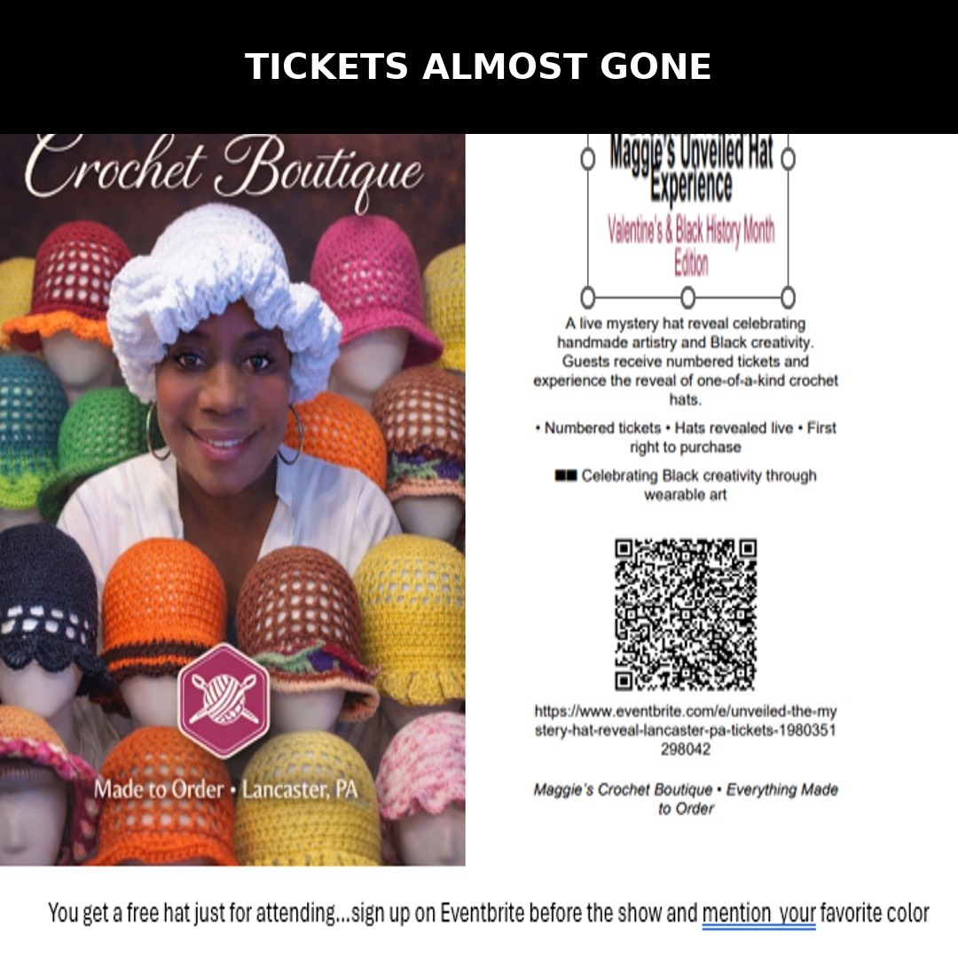 The event is a mystery hat reveal featuring handmade, one-of-a-kind crochet hats revealed live by numbered tickets. It celebrates Valentine’s season while honoring Black creativity and craftsmanship during Black History Month. Event Details: • Date: February 21, 2026 • Location: Lancaster, PA • Entry: $15 • Tickets: https://www.eventbrite.com/e/unveiled-the-mystery-hat-reveal-lancaster-pa-tickets-1980351298042