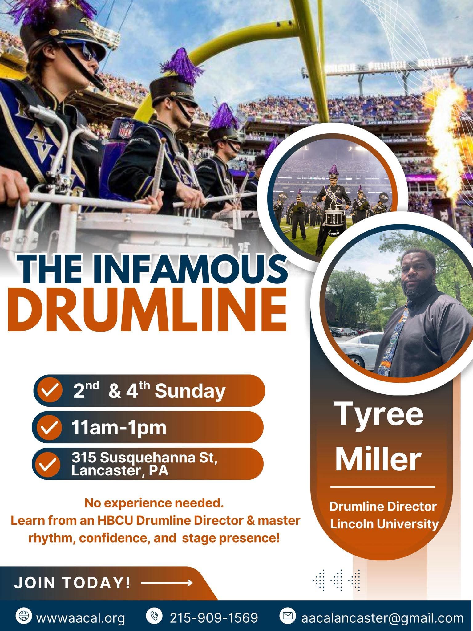315 Susquehanna St. 315 Susquehanna St., Lancaster, Pennsylvania, United StatesJoin the African American Cultural Alliance Drumline, where youth and adults are taught by HBCU Drum Instructor Tyree Miller. Participants will learn the fundamentals of marching percussion, teamwork, and performance. We currently have openings for four additional youth ages 10 and up to join the roster—no experience necessary! This is a great opportunity to build […]