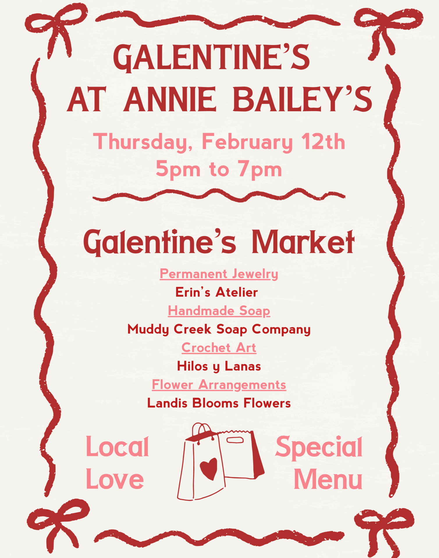 On February 12th from 5pm to 7pm, Annie Bailey's will be hosting a Galentine's Day Market for all the ladies to enjoy! The market will have four vendors-- Erin's Atelier (permanent jewlery), Hilos y Lanas (crochet creations), Landis Blooms Flowers (build your own bouquet), and Muddy Creek Soap Company (homemade soap products). We will have […]