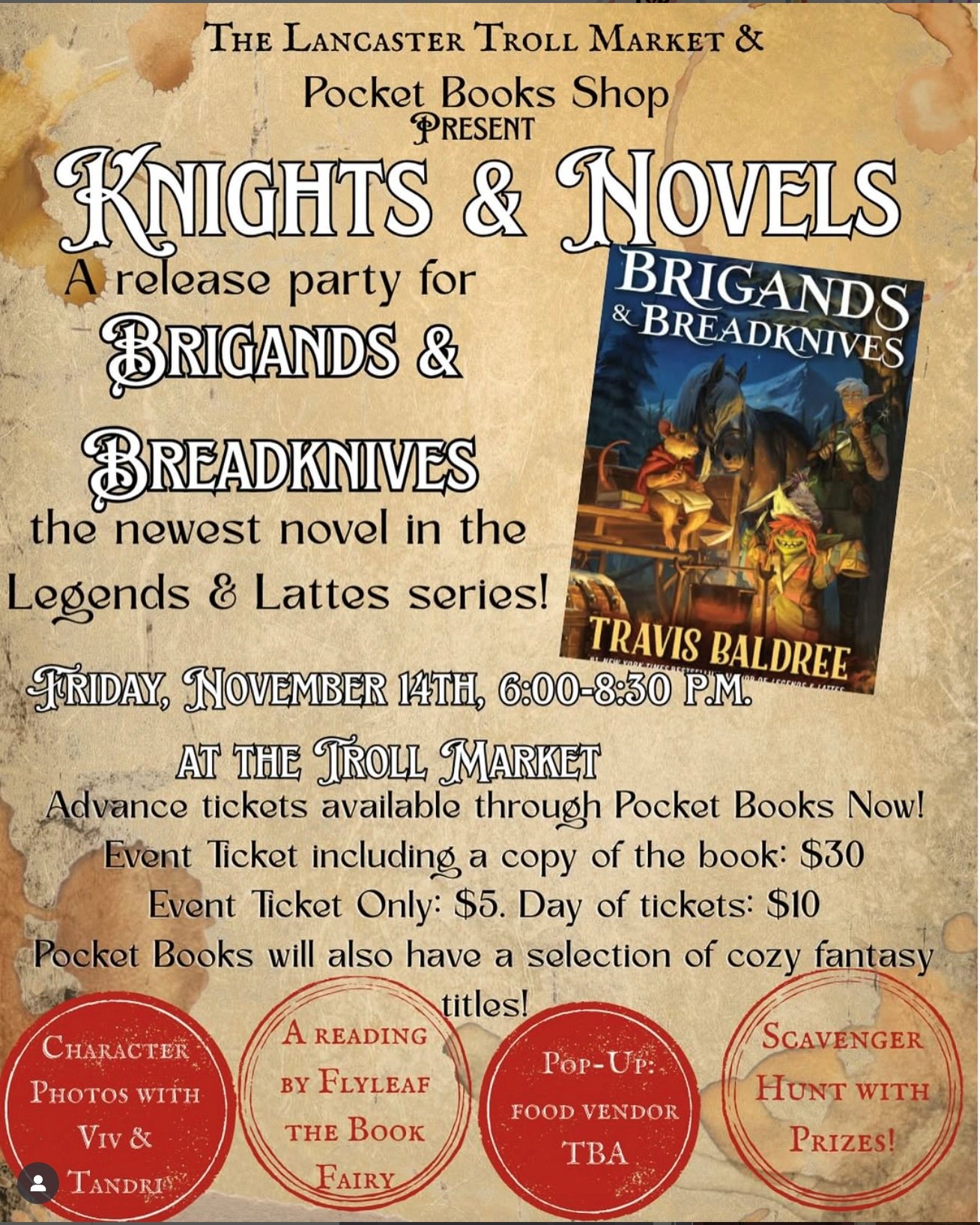 Lancaster Troll Market 44 N Queen St, Lancaster, Pennsylvania, United StatesJoin Pocket Books and the Lancaster Troll Market for a party celebrating the release of the newest book in the Legends & Lattes universe, Brigands and Breadknives. Food, character photos, a reading from the book, and prizes galore await you! We'll also have a selection of other Travis Baldree titles & delightful cozy fantasy for […]