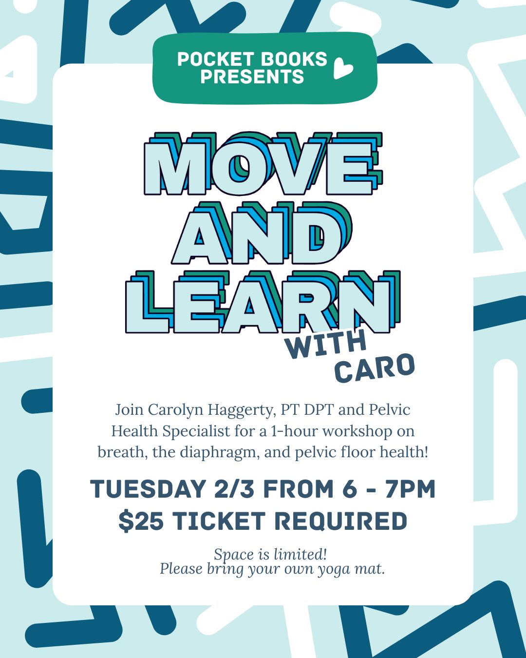 On Tuesday, Feb 3rd at Pocket Books Shop, join Carolyn Haggerty, PT DPT and Pelvic Health Specialist for a 1-hour workshop on breath, the diaphragm, and pelvic floor health! Space is limited! Please bring your own yoga mat.